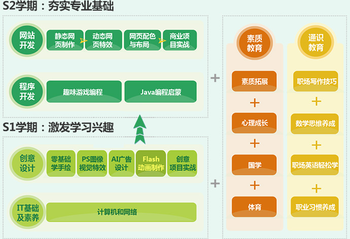 理论课、上机课、趣味拓展课、职素竞赛课、文化修养课、项目实践课